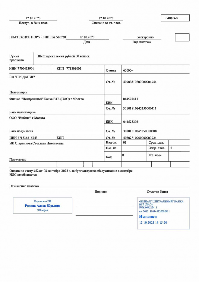 Оплачен счет за бухгалтерское обслуживание портала "Предание" в сентябре 2023 г.