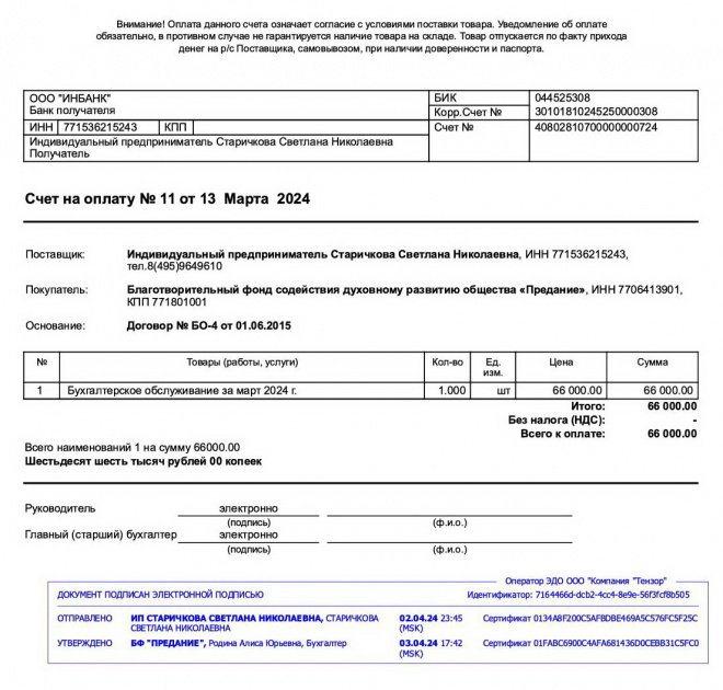 Оплачен счет за бухгалтерское обслуживание портала "Предание" в марте 2024 г.