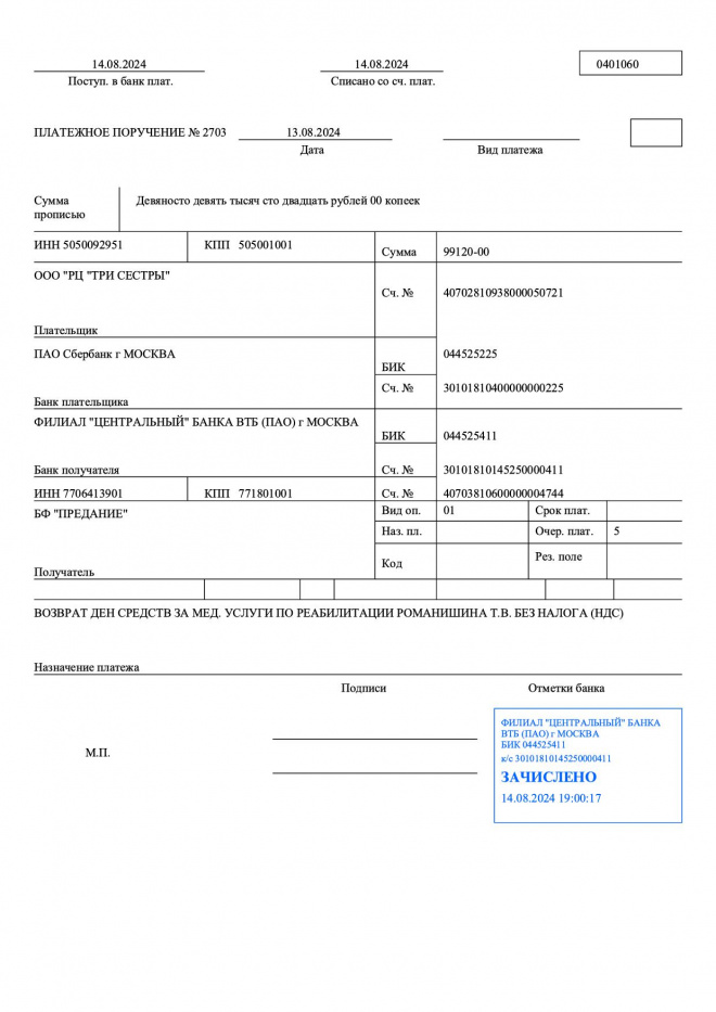 Оплачен курс реабилитации Татьяны Романишиной в центре "Три сестры". Неизрасходованные средства возвращены на счет фонда