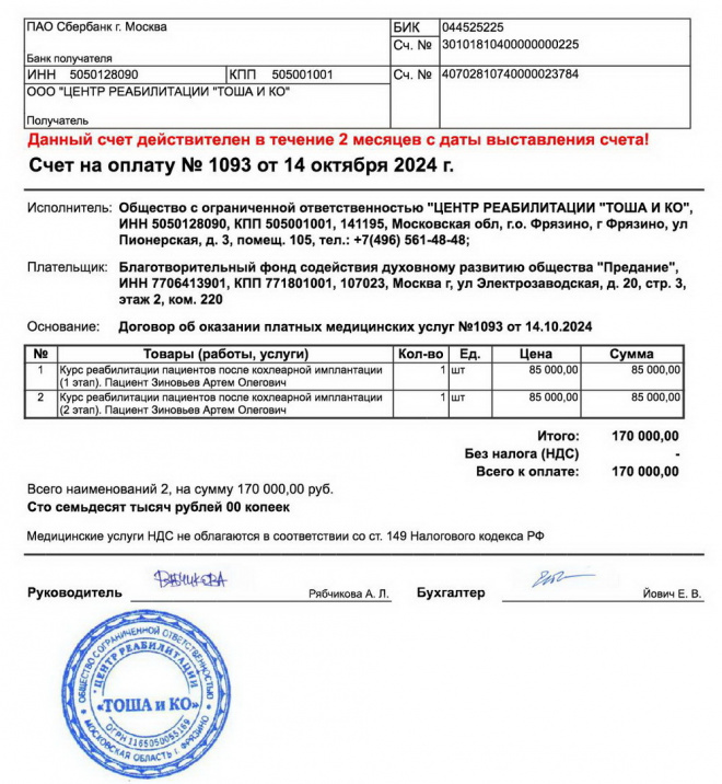 Оплачен курс реабилитации Артёма Зиновьева в центре "ТОША и КО"