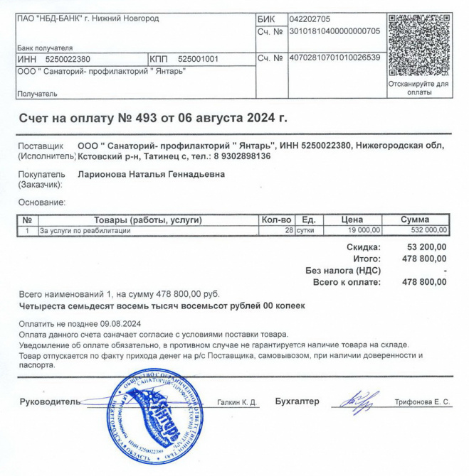 Оплачен курс реабилитации Натальи Ларионовой в центре "Янтарь"