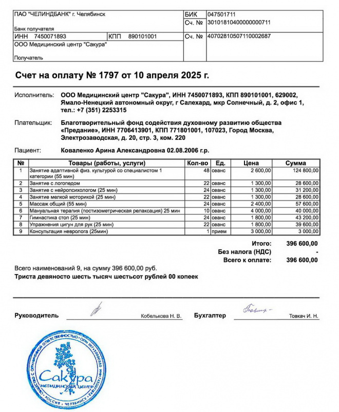 Оплачен курс реабилитации Арины Коваленко в МЦ "Сакура"