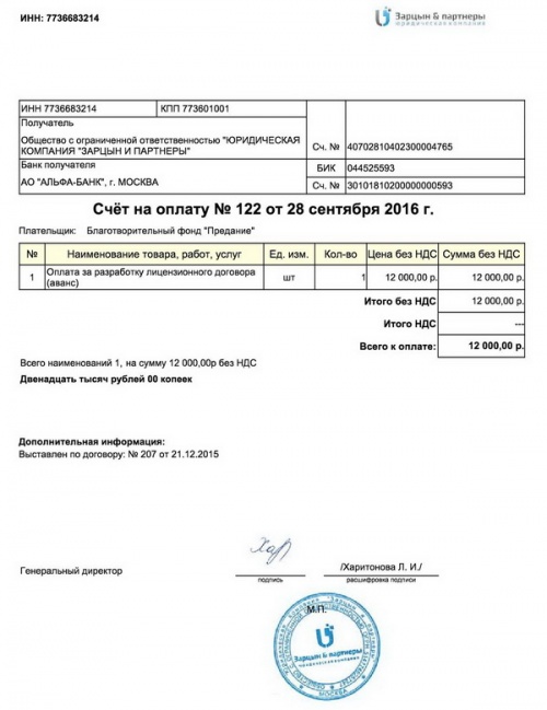 Оплачен счет за разработку лицензионного договора