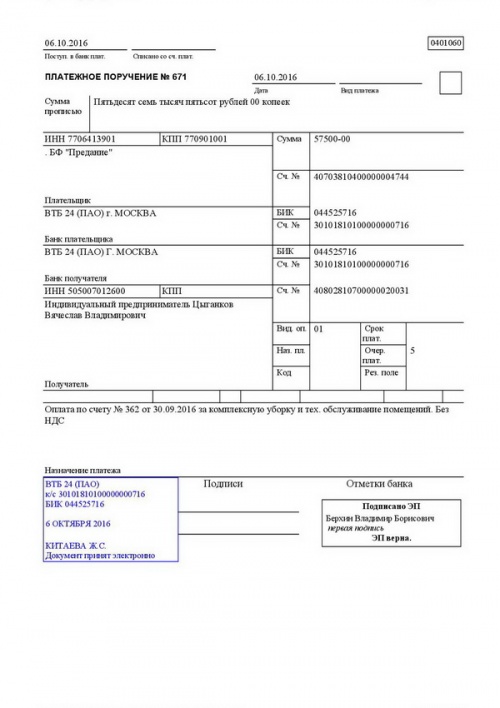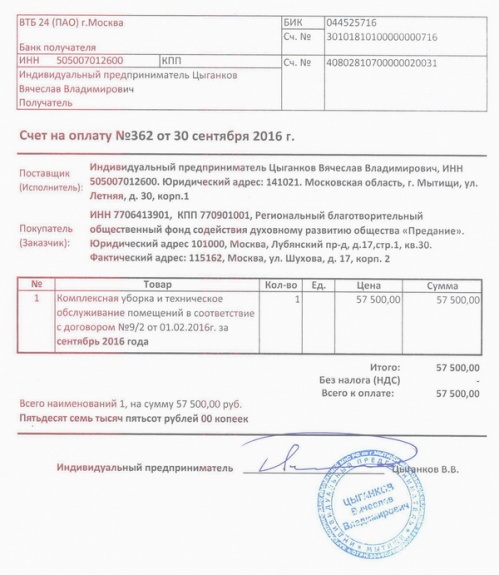 Оплачен счет за комплексную уборку и техническое обслуживание здания, в котором находится наш офис, в сентябре 2016 г.