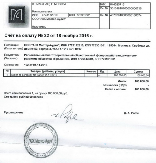 Оплачен счет за проведение аудиторской проверки деятельности фонда в 2015 году