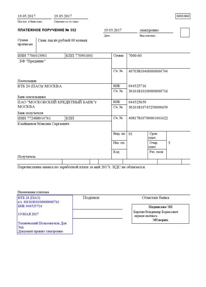 Перечисление аванса за май 2017 года