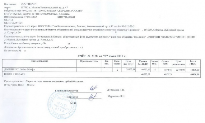 В рамках программы срочной помощи мы купили две упаковки антибиотика "Дорипрекс" Елена Степановой, страдающей заболеванием легких
