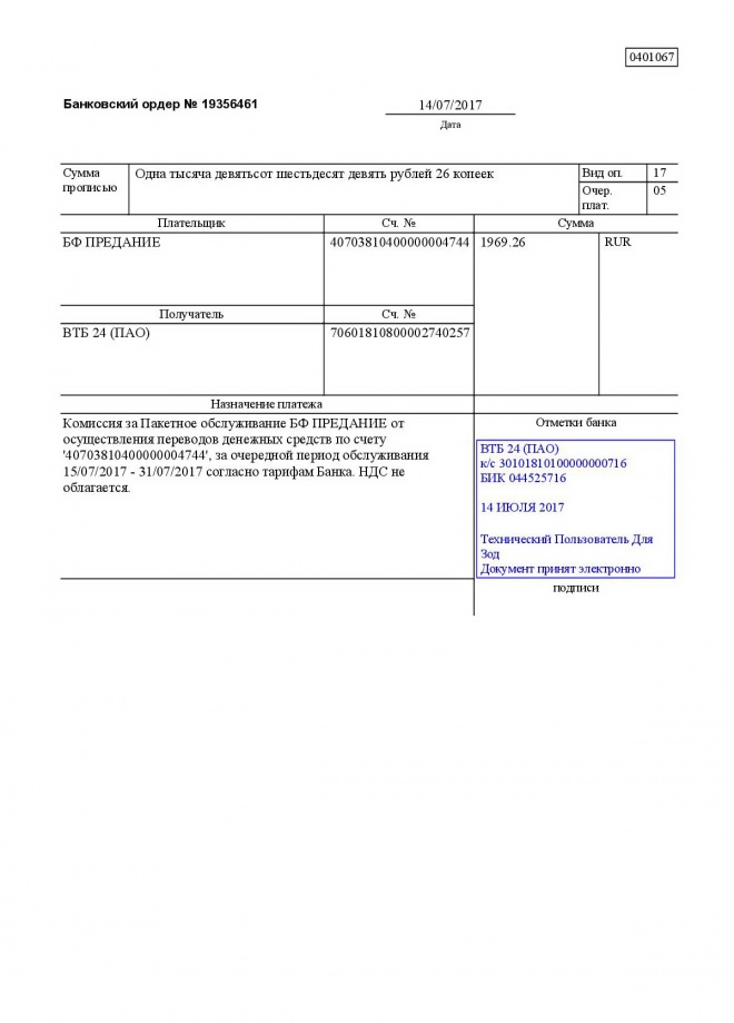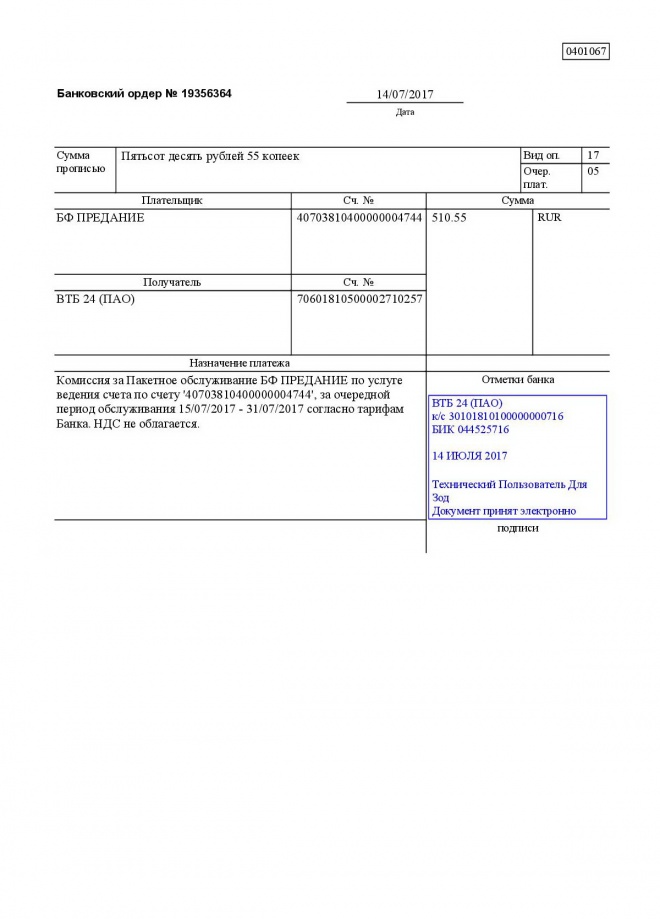 Комиссии по обслуживанию наших банковских счетов в июле 2017 г.