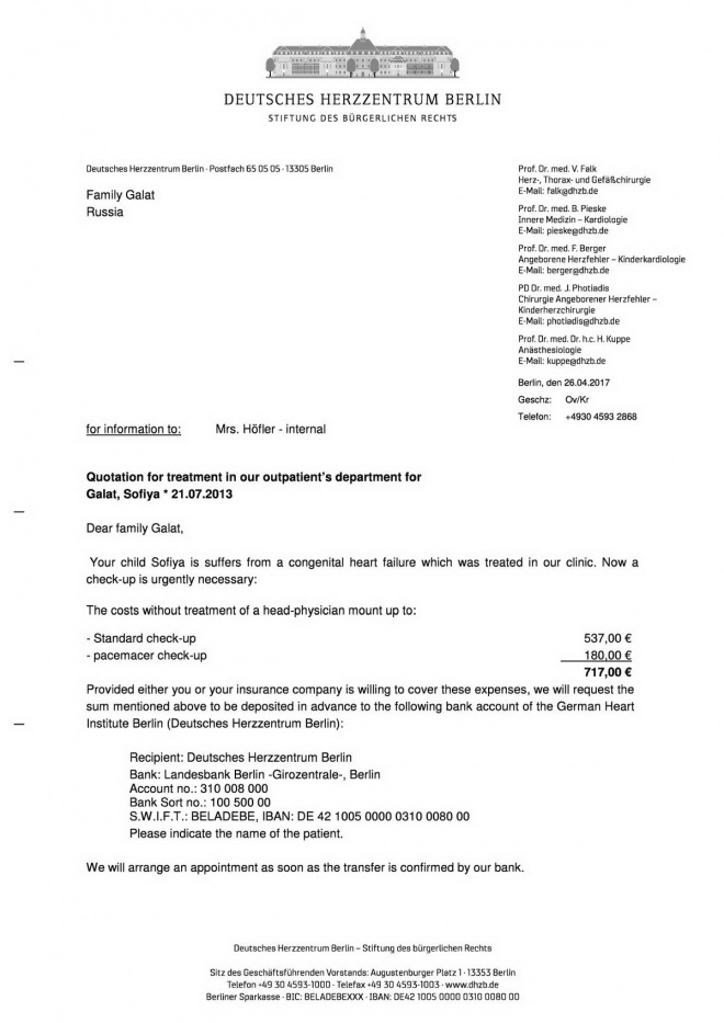 Часть оставшихся средств переведена в счет оплаты очередного контрольного обследования Софии Галат в Берлинском кардиоцентре (оплата со счета фонда в Италии)