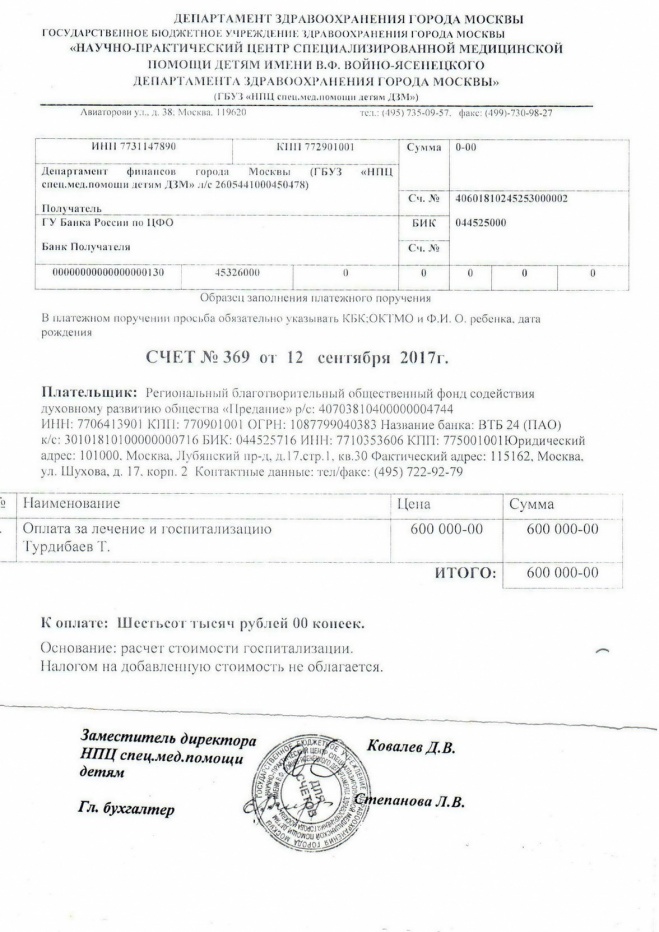 Оплачен второй счет за лечения Тимура Кан (Турдибаева) в паллиативном отделении в НПЦ спец. мед. помощи детям в Солнцево. .Неиспользованные средства возвращены на счет фонда.