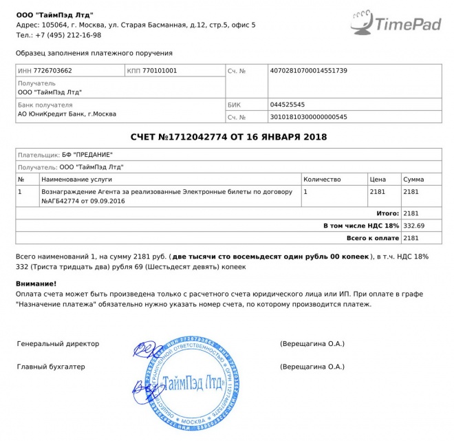 Оплачена комиссия за услуги сервиса "ТаймПэд", помогавшего нам с организацией лекций в декабре 2017 г.