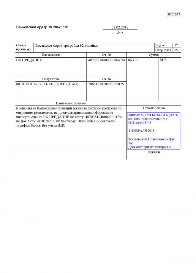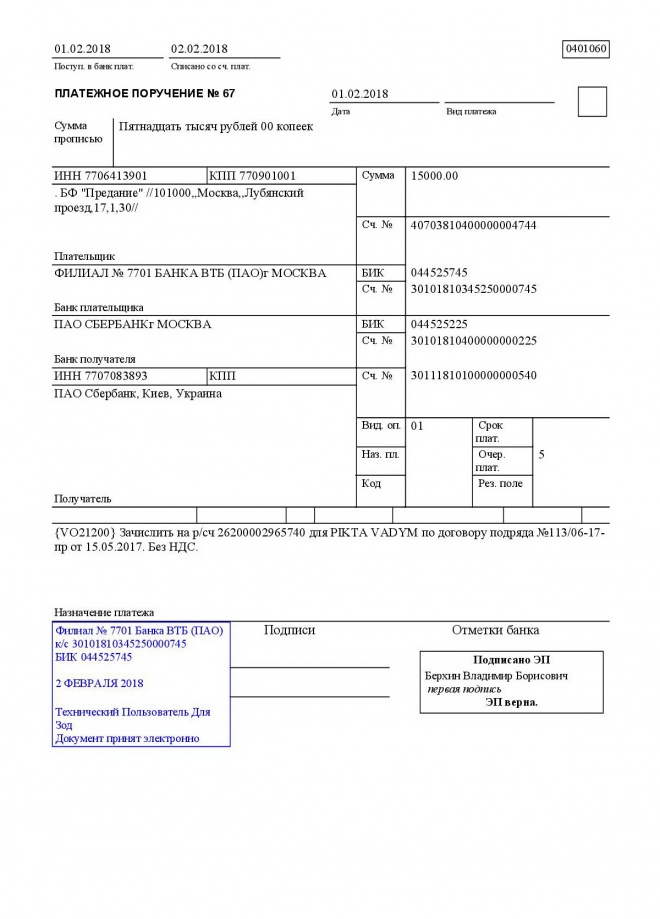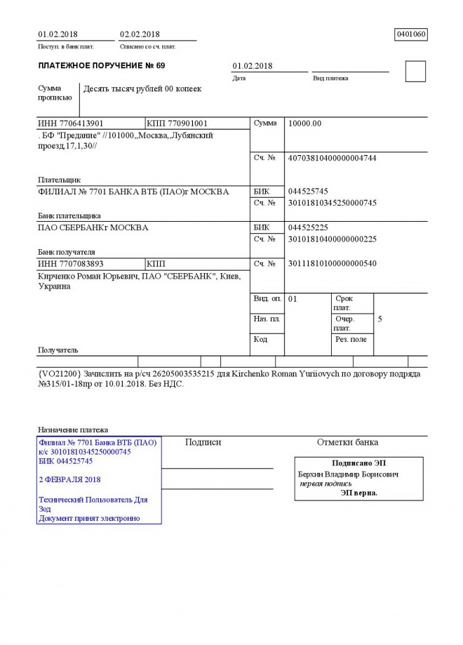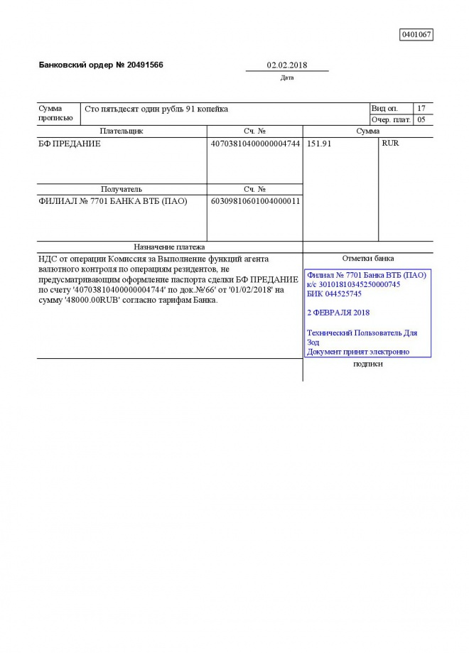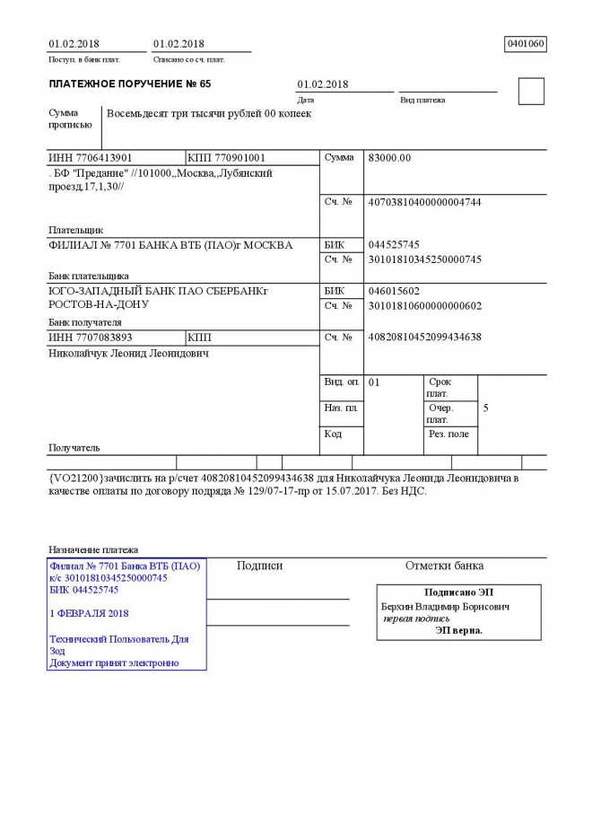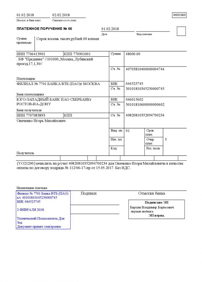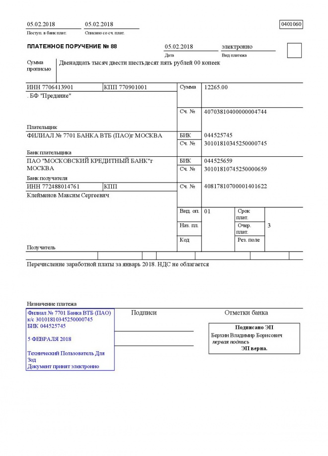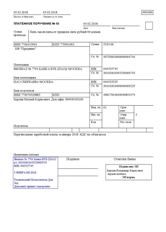 Перечисление заработной платы сотрудникам за январь 2018 г.