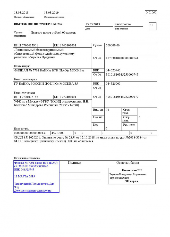 Оплачен счет за лечение Ксении Брашовяну в онкологическом центре им. Н.Н. Блохина