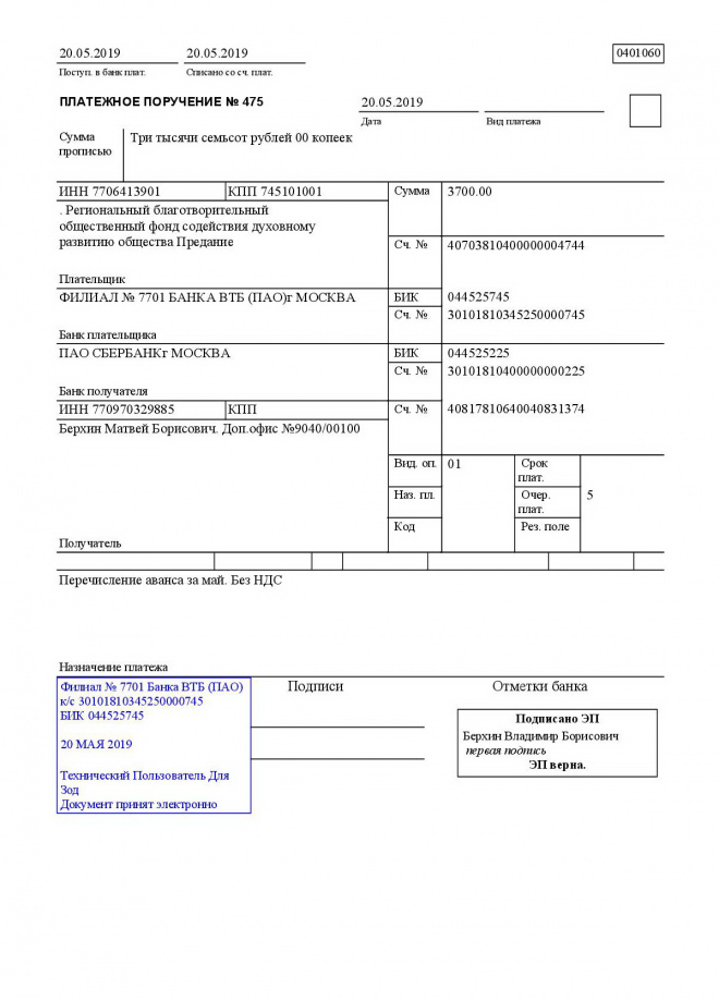 Перечислен аванс по заработной плате сотрудникам за май 2019 г.