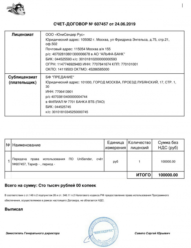 Пожертвование согласно ст.582 ГК РФ. Без налога (НДС)