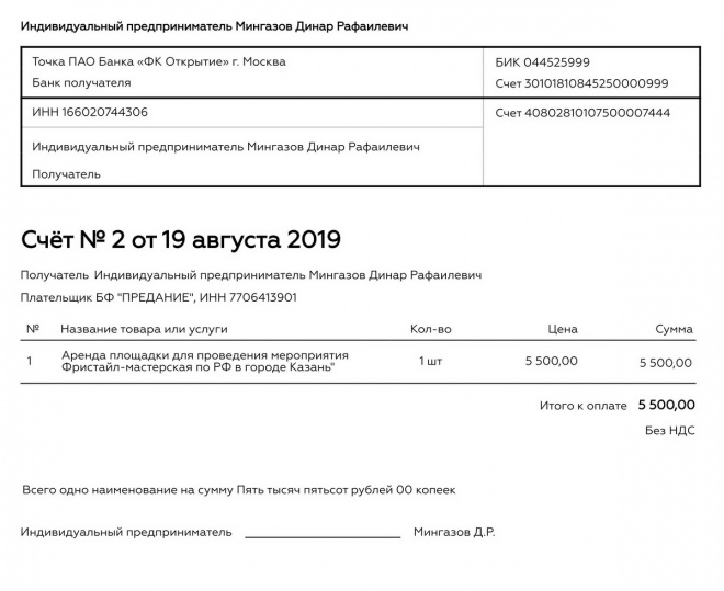 Оплачен счет за аренду площадки для проведения мероприятия "Фристайл-мастерская" в г. Казань