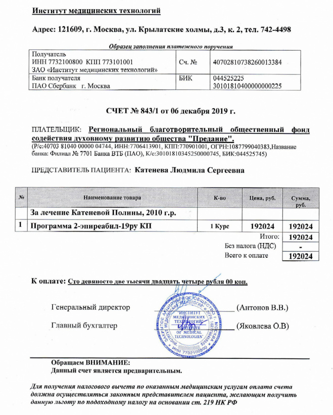 Оплачен курс лечения Полины Катеневой в Институте медицинских технологий в г. Москве