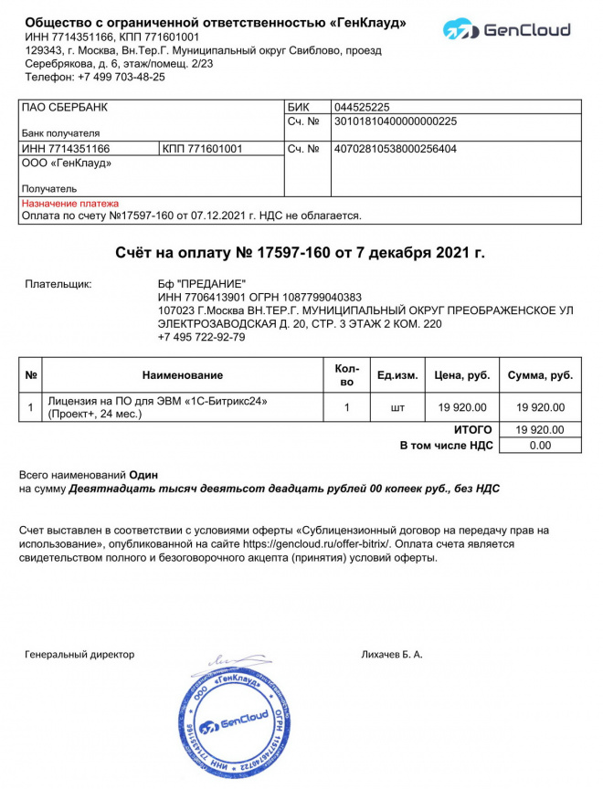 Оплачена покупка годовой лицензии ПО "1С-Битрикс24"